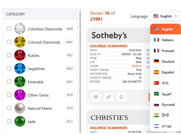 subscribers access to details of thousands of important diamonds and gemstones sold at jewellery auctions worldwide.